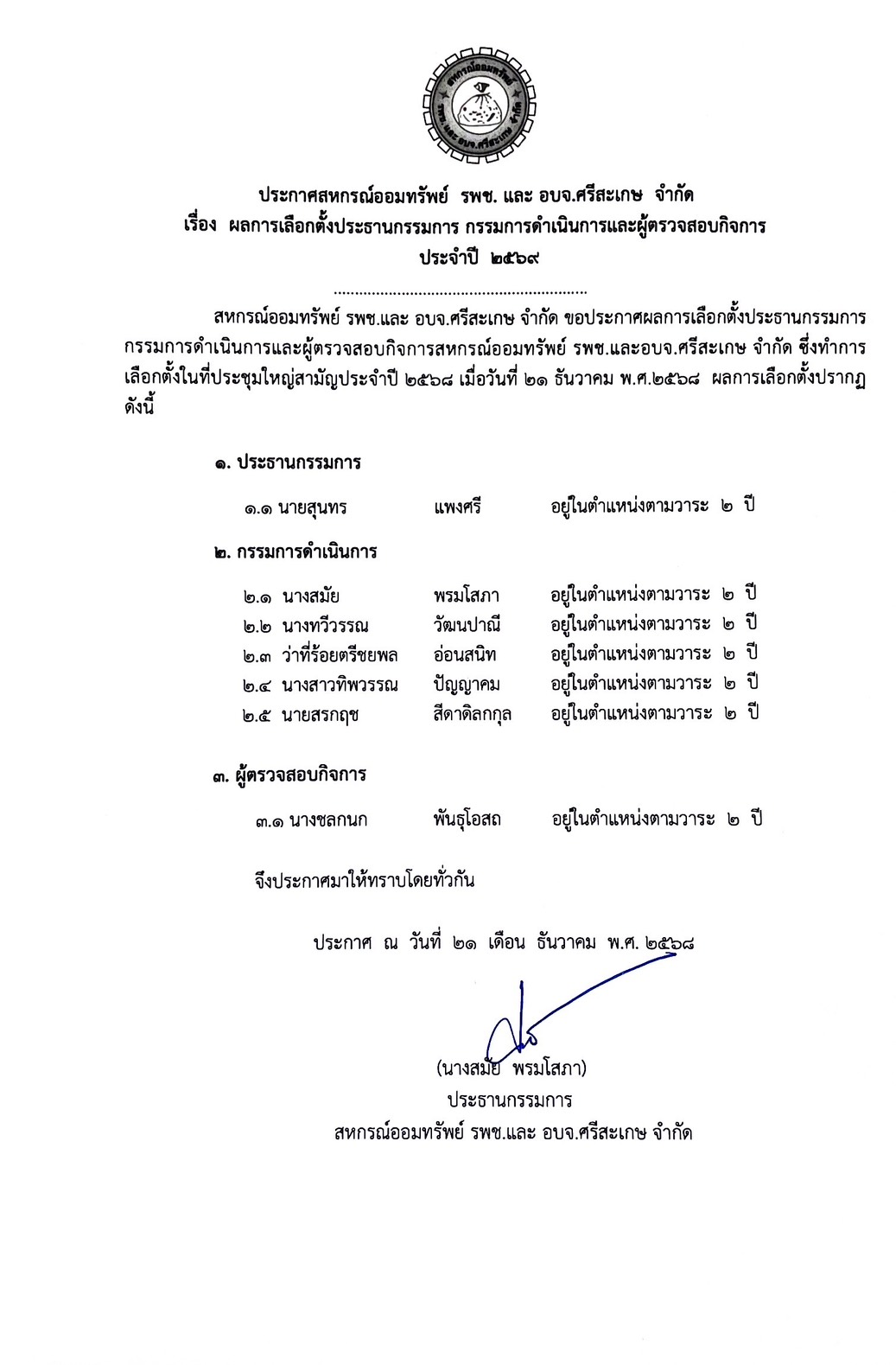 เรื่อง ผลการเลือกตั้งประธามกรรมการ กรรมการดำเนินการและผู้ตรรจสอบกิจการ ประจำปี 2569